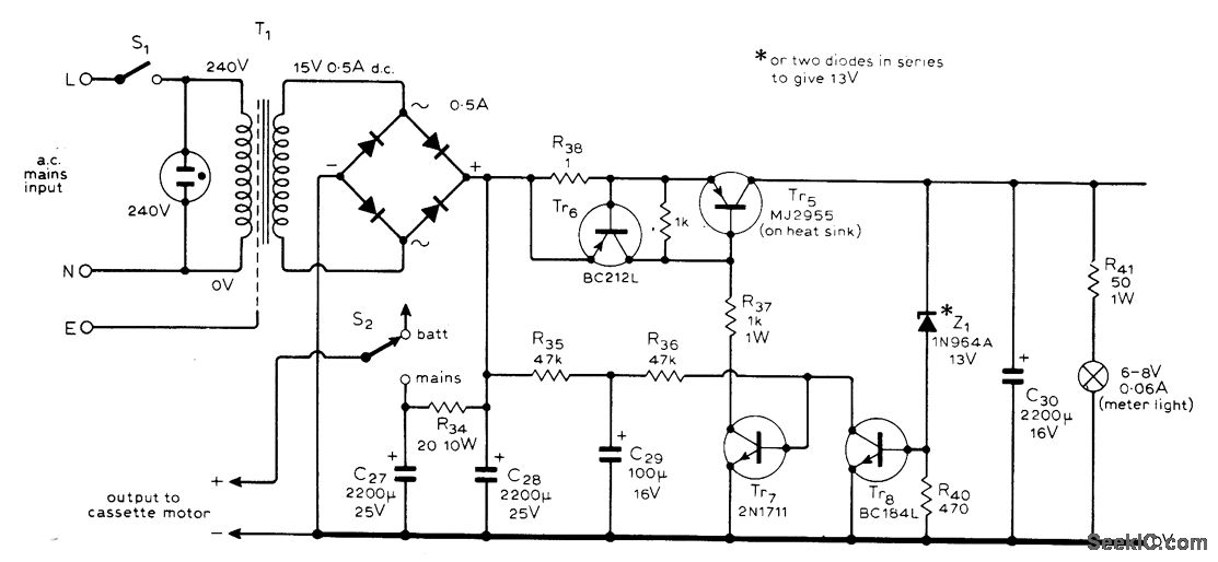 Used in high-quality stereo cassette deck operating from AC line or battery. For U.S. applications, use 120-V power transformer. Power for cassette motor is taken directly from power-supply filter capacitors through 20-ohm 10-W resistor, with negative return line connecting directly to filter capacitors instead of chassis, to eliminate noise originating from pulsating current of cassette-drive motor-control circuit. Article gives all other circuits of cassette deck and describes operation in detail.-J. L. Linsley Hood, Low-Noise, Low-cost Cassette Deck, Wireless World, Part 2 - June 1976, p 62-66 (Part1 - May 1976, p 36-40;Part 3 – Aug. 1976,p 55-56).