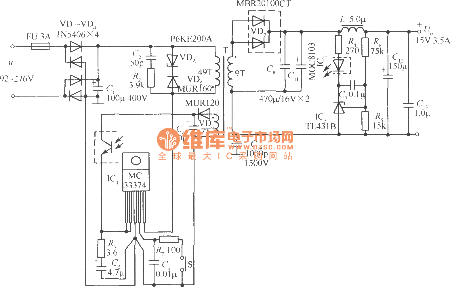 The 15V/3.5A 52W switching power supply circuit which is composed of the MC33374T/TV is as shown in the figure. The permitted range of the AC input voltage u is 92~276V. The rectifier bridges VD1~VD4 use four 1N5406 type 3A/600V siliconrectifier tube. The primary protection circuit is composed of the RC absorbing circuit (R2, C2) and the clamping circuit (VDz, VD5), it can effectively inhibit the peak voltage which is produced the leakage inductance of the high frequency transformer to protect the MC33374 internal power switching tube away from the damage. The VDz uses the P6KE200A type transient voltage suppression diode (TVS), the reverse breakdown voltage UB=200V. The VD5 uses the MURl60 type ultrafast recovery diode (SRD).