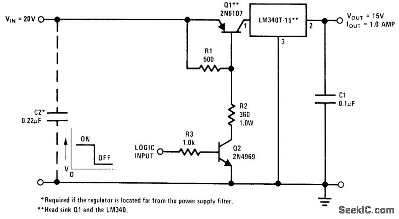 Arrangement shown provides practical method d shutting down LM340T-15 or similar regulator under control of ff L or DTL gate. Pass transistor Q1 operates as saturated transistor when logic input is high (2.4 V minimum for TTL) and Q2 is turned on. When logic input is low (below 0.4 V for TTL), Q2 andQ1 are off and regulator is in effect shut down.- Linear Applications, Vol.2, National Semiconductor, Santa Clara, CA, 1976, AN.103, p 11.