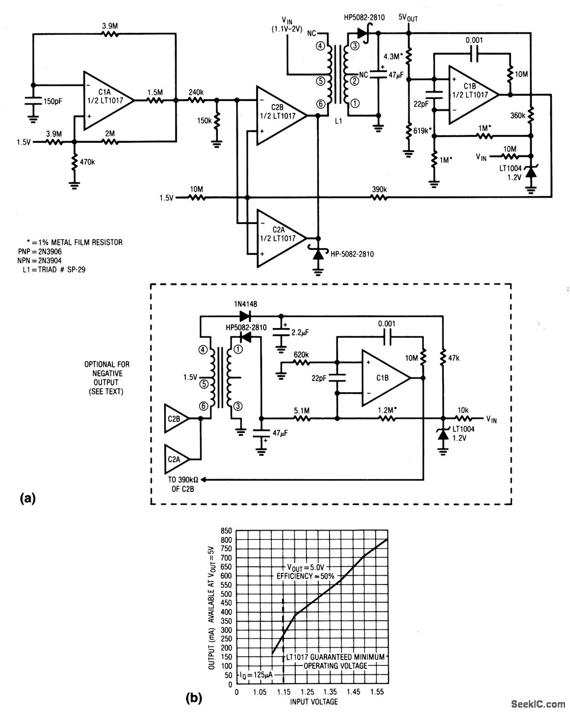 This circuit converts a single 1.5-V cell to a 5-V output with only 125 μA of quiescent current. Figure 8-47B shows a plot of output current versus input voltage. The optional connection (shown in dashed lines) uses the floating secondary of the transformer to produce a -5-V output.