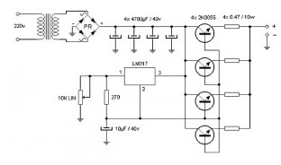 As is shown in the wiring diagram the15 A adjustable power supply provides similar amount of current through the parallel work of four power transistors, which must be mounted on a good heatsink. The voltage adjustment is performed in integrated LM317, which also must be dissipated mechanically.