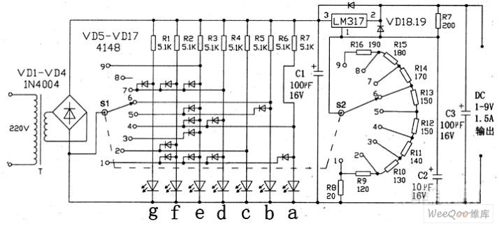 The adjustable regulated power supply which is made by the LM317 is common, the 1-9V regulated power supply additional device is as shown in the figure. This regulated power supply can output the DC 1~9V according to the need, and it chooses the red LED digital tube to display the output voltage of 1~9.