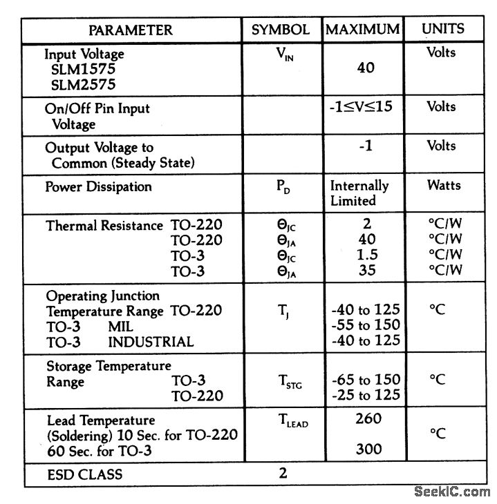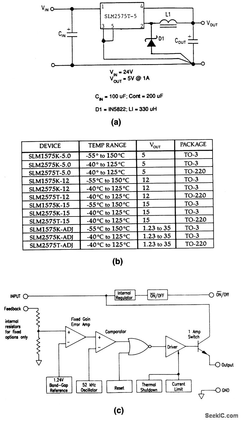 The SLM switching-regulator ICs contain most elements necessary for converter operation, as shown in Fig. 4-2C. Figure 4-2B shows the output voltage and characteristics for various part numbers. Figure 4-2D shows the absolute maximum ratings. Simply add a choke, catch diode, and two capacitors to the IC for a complete converter.