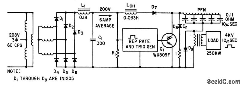 Line-type modulator uses silicon diodes for high-voltage rectifiers, backswing, holdoff, and inverse-diode circuits. Trigger generator uses two-layer and four-layer diodes to provide pulse burst repetition rates up to 25 kc.-H. G. Heard, Controlled Rectifier Produces Quarter-Mega watt Pulse Power, Electronics, 34:25, p 54-55.