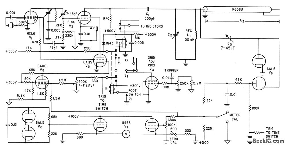 Applies r-f energy to spot-weld retina back to original position by creating small burn scars. Crystal-controlled electron-coupled oscillator drives class C power amplifier V2. Sample of output is taken through C3, detected in V8, and applied to grid of V5, which amplifies out put changes and applies them to grid of clamp tube V3 to restore output of V2 to desired level .-O. Rick ,Jr. and R.V. Hill, R-F Spot Welder Reattaches Retina of Human Eye, Electronics, 34:32, p 160-163.