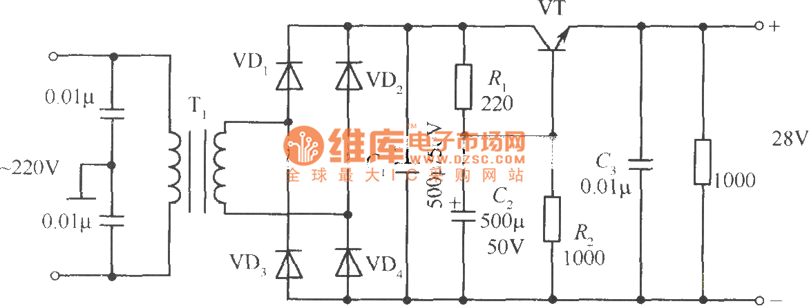http://www.seekic.com/circuit_diagram/Power_Supply_Circuit/28V_Simple_regulated_power_supply_circuit.html
