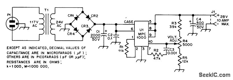 Developed for 60-W UHF linear amplifier. C1 and C4 are computer-grade electrolytics. CR1-CR4 are Motorola 1N3209 100-PIV 10-A silicon diodes. U1 is Motorola MPC100 or equivalent voltage regulator mounted on heatsink, T1 is Stancor P-8619 or equivalent 24-V 8-A transformer.-J. Buscemi, A 60-Watt Solid-State UHF Linear Amplifier, QST, July 1977, p 42-45.
