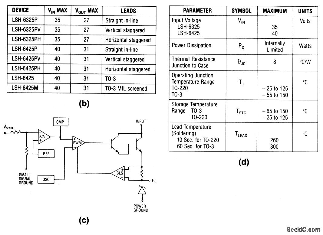 The LSH switching-regulator ICs contain most elements necessary for converter operation, as shown in Fig. 4-3C. Figure 4-2B shows the output voltage and characteristics for various part numbers. Figure 4-3D shows the absolute maximum ratings. Simply add a choke, catch diode, and two capacitors to the IC for a complete converter.