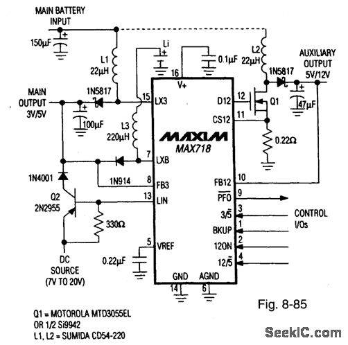 Figure 8-85 shows a MAX718 dual regulator connected to provide a maln 3.3-V/5-V output and an auxiliary 5-V/12-V output, with a 0.9-V to VOUT input range, and a start-up of 1.4 V Quiescent curren(VIN=3 V)is 140 μA for the main 5-V output.and 500 μA with both outputs. The maximum load-current capability of the malnsupply is 400 mA and 120 mA for the auxiliary Supply.Figure 8-86 shows theefficiency curves,The circuit can generate 3.3 V and 5 V, 3.3 V, and 12 V, or 5 V and 12 V, depending on the state of the logic inputs at pms 3 and 4.Two regulatedoutput voltages are generated from one of three input-voltage Sources∶an ac/dc wall-cube adapter(7 V or 20 V), a maln two-cell or three-cell battery,or a backuplithium battery. The dotted-line connection at the top of L2, which Powers theauxiliary supply, is normallv hard-wired to the maln battery,but it can also beconnected to the maln output when Power comes from the ac wall adapter. The main switching regulator automatically shuts off to save the batteries when the ac/dc wall cube is plugged in, MAXIM BATTERY MANAGEMENT CIRCUIT COLLECTION,1994, P.11.