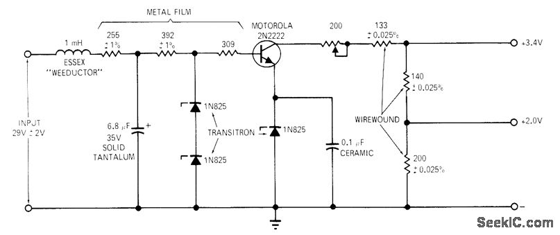 Two-stage regulator is combined with special filter design that helps keep output voltage free of gamma-produced transients and RFI. Voltage divider using wirewound resistors provides 2-V output. Gamma radiation of 1,000,000 rads caused only 0.3% change in output voltages. Article covers procedure for designing and testing circuits that are to be operated in high-radiation environment.-A. J. Sofia, Designing a Radiation-Stable Voltage Reference, EDN Magazine, Sept. 15, 1970, p 39-41.