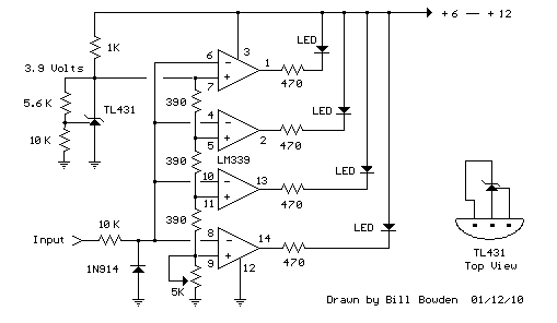 This is a similar circuit to the above and provides a 4 LED bar graph indicating the voltage of a common 3.6 volt Lithium - Ion recharable cell phone battery. The reference voltage is provided by a TL431 programmable voltage source which is set to 3.9 volts where the TL431 connects to the 1K resistor. The lower reference for the LED at pin 14 is set with the 5K adjustable resistor.