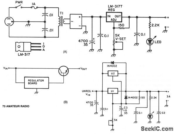 U1, an LM317 adjustable regulator provides short-circuit protection and automatic current limiting at 1.5 A. The input voltage to the regulator is supplied by DB1, a 4-A 100 PIV full-wave bridge rectifier. Capacitor C1 provides initial filtering. U1 provides additional electronic filtering as part of the regulating function. The output level of the regulator is set by trimpot R1. Bypass capacitors on the input and output of U1 prevent high-frequency oscillation. The current rating of the transformer must be at least 1.8 times the rated continuous-duty output of the supply. This means that a 1.5-A supply should use a 2.7-A transformer. For light or intermittent loads, a smaller 2.0-A transformer should suffice.Wiring a second LM317, U2, in parallel with U1 is a quick and clean way to increase the current-limiting threshold to 3 A without sacrificing short-circuit protection. When more than 3 A is required, the regulator module can be used to drive the base of one or more pass-transistors (see Fig. 75-2B).