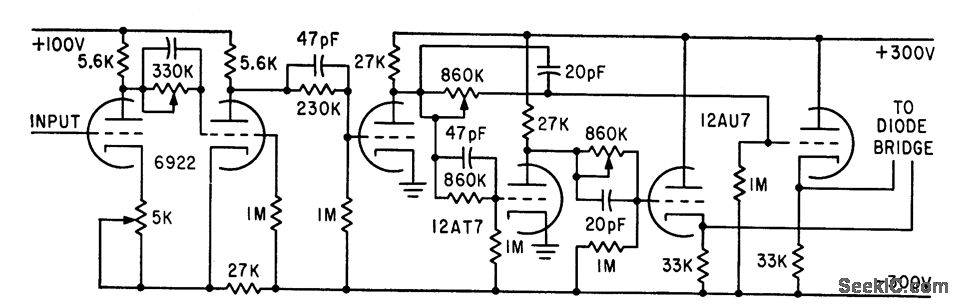 Schmitt trigger acts as comparator about 0 v and provides input to two pulse amplifiers. Cathode followers furnish push-pull output at low impedance necessary to drive a 6AL5 diode bridge. Permits two sampled-hold circuits to be run as memory pair in analog computer.-T. A. Brubaker, Precision Analog Memory has Extended Frequency Response, Electronics, 34:39, p 141-143.
