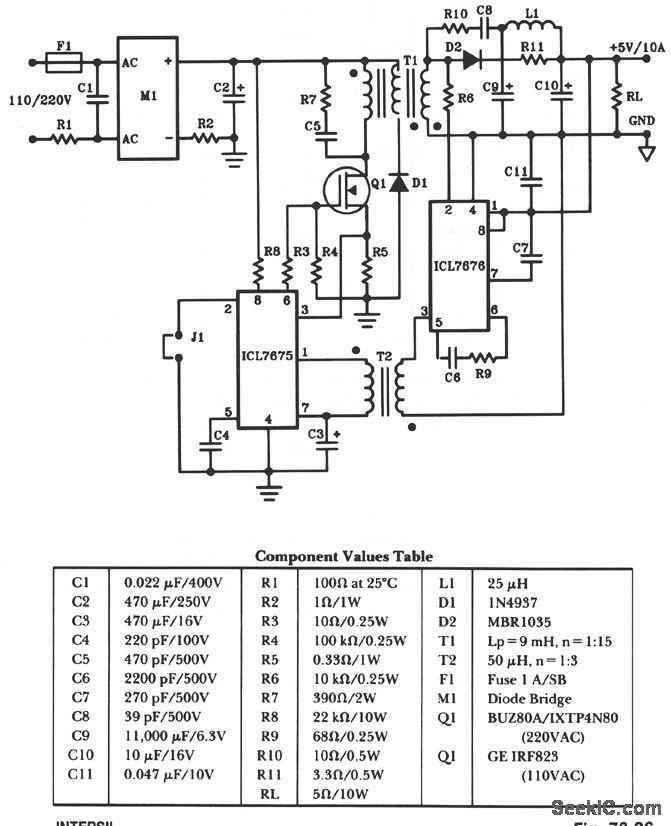 The schematic shows a 50-W power supply with a 5-V 10-A output. It is a flyback converter operating in the continuous mode. The circuit features a primary side and secondary side controller will full-protection from fault conditions such as overcurrent. After the fault condition has been removed, the power supply will enter the soft-start cycle before recommencing normal operation.