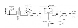 Voltage of 220V to the transformer via the power switch with built-in fluorescent light. Output voltage of 40V transformer has a improved and filtered after reaching approx. 57V. 100nF capacitors improve the performance of the source against the ripple. LM317 chip in a high voltage is responsible for regulating the output voltage through the resistor divider formed by resistor 220 ohm and potentiometer adjustments (which must be multi-turn). 10μF capacitor in the regulatory lines prevents fluctuations of regulation while the 1N5404 diode prevents the capacitor discharge that can damage integrated circuits. Two output capacitors are responsible for adequately filter the resulting voltage.