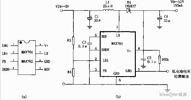 The 5V-12V boost power supply shown in the picture is composed of high efficiency,low power consumption boost DC converter,MAX761 and a few peripheral components.Its features are: First,transformation efficiency is 86%.Second,static currentis 110μA.Third, with low battery voltage detection function.R3 and R4 in the picture are testing dividing resistor and they can be caculated according to experience formula: R4=R3(VTPIP/1.5-1),VTPIP is test trigger voltage.