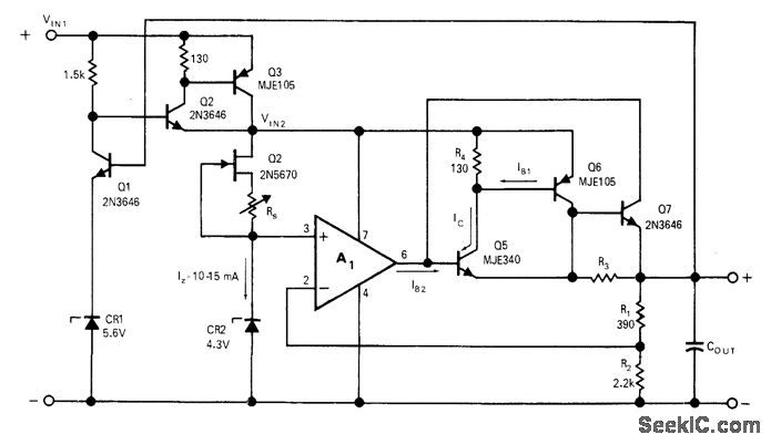 Use of Darlington at output boosts power rating of standard opamp voltage regulator circuit. Article gives step-by-step design procedure. With μA741 opamp, circuit gives good regulation along with short-circuit protection. AC ripple is less than 2 mV P-P. Required input of 30V is obtained from conventional full-wave bridge rectifier with capacitor-input filter.-C, Brogado, IC Op Amps Simplify Regulator Design, EDN/EEE Magazine, Jan. 15, 1972, p 30-34.