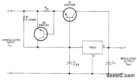 Choice of regulator in 7800 series determines value of output voltage that is maintained within 0.05% of its actual value. Choose regulator for voltage desired. Unregulated input Vin must be at least 2 V higher than regulator rating. Transient suppression capacitor CT is typically 10 to 50 μF. Output current is increased above IC rating by using PNP series-pass transistor Q1 which has maximum collector current of 30 A. Protection circuit Q2 pre-vents burnout of power transistor. Choose RSC for limiting current value to desired value.-J.E. Trulove, Three-Terminal Voltage-Regulator ICs, Ham Radio, Dec. 1973, p 26-30.