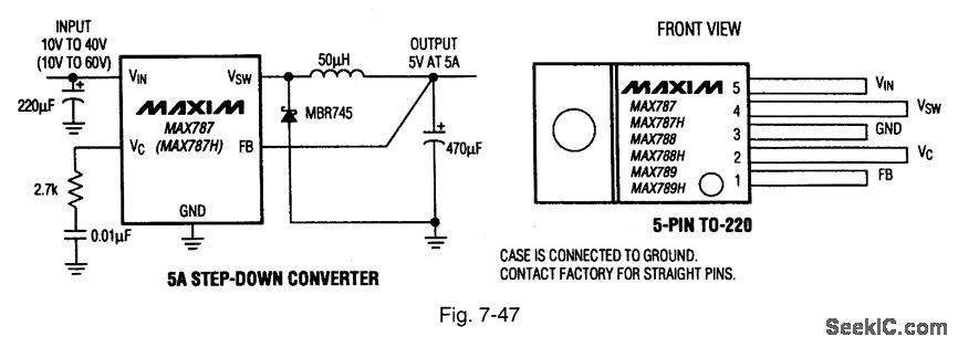 Figure 7-47 shows the MAX787 connected to provide an output of +5 V at 5 A, with an input of 10 V to 40 V. The MAX787/88/89 provide 5-A outputs at 5 V, 3.3 V, and 3 V, respectively. Quiescent current is 8.5 mA. The ICs are also available in TO-3 packages. MAXIM NEW RELEASES DATA Book, 1994, P. 4-245.