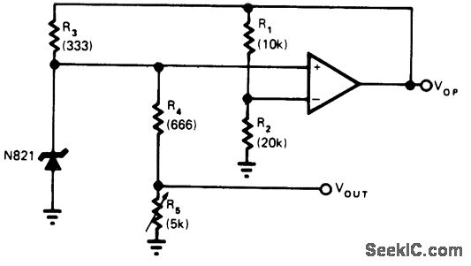 Circuit uses single pot with standard opamp to ad just output voltage and simultaneously set current of 6.2-V zener at optimum value for temperature stability. With some opamps, emitter-follower may be needed at opamp output to supply necessary zener current. Technique eliminates need for separate zener current adjustment or permits use of lower-cost zener.-K. Hanna, Single Control Adjusts Voltage Reference, EDN Magazine, June 5, 1976, p 117.