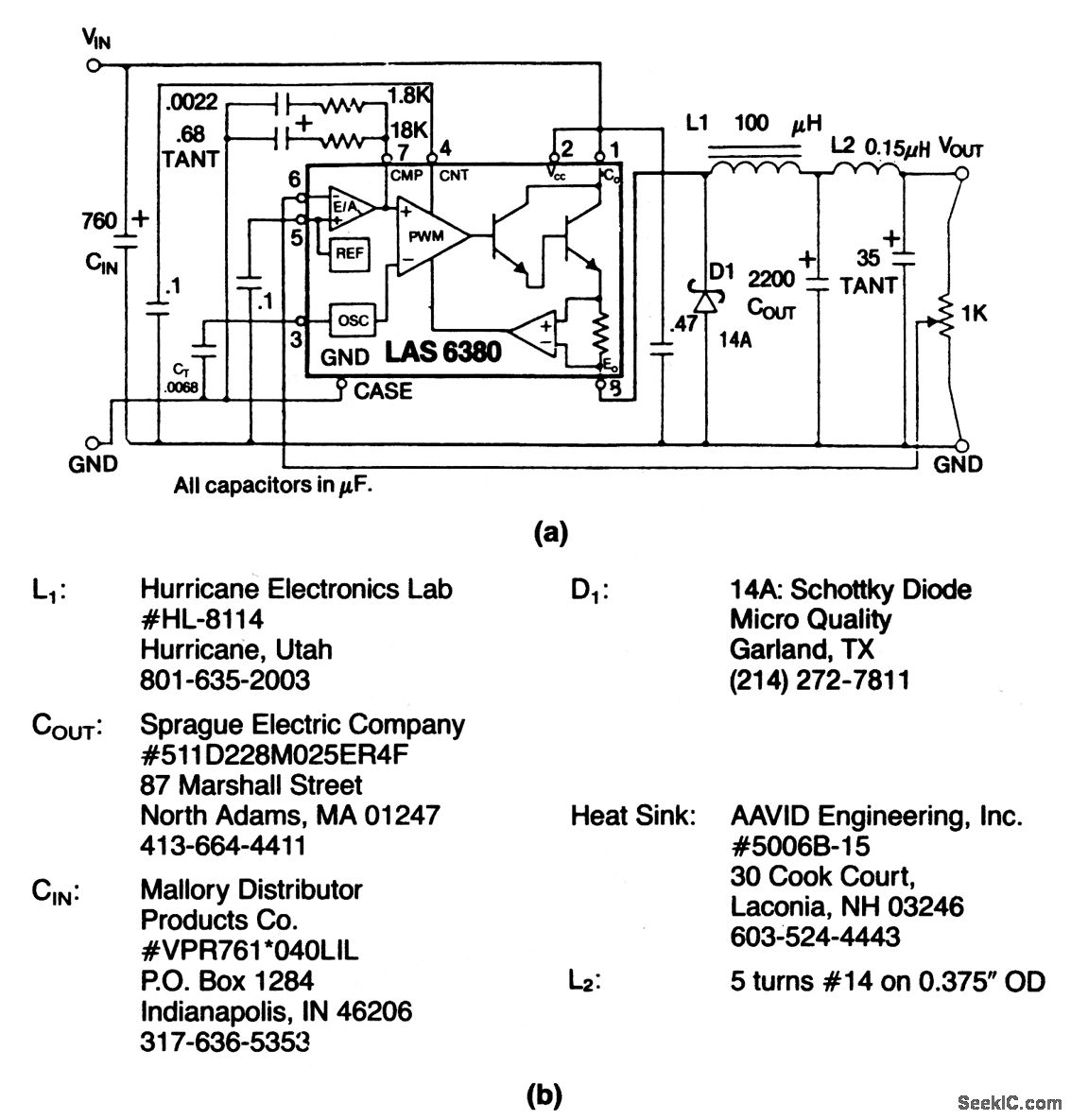 This circuit provides 5-V output(adjustable)at 8A.Figure 4-21B shows component source information.