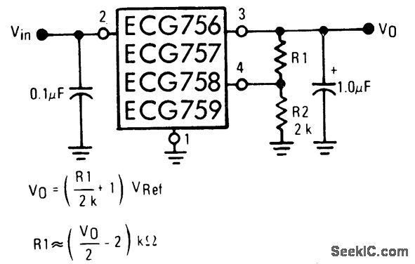 5-volt regulator. Input voltage should not exceed 22 volts for the ECG758 and ECG759 or 38 volts for the ECG756 and ECG757. All of these units are 4-lead packages (courtesy GTE Sylvania Incorporated).