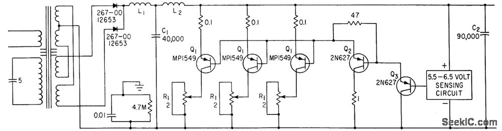 Constant-voltage ferrores-onant transformer with full-wave silicon rectifiers is supplemented by shunt transistors driven by error signal from zener-reference sensing circuit.-J. r. Keefe, Transformer and Shunt Transistors Regulate D-C Power Supply, Electronics, 34:20, p 99-101.