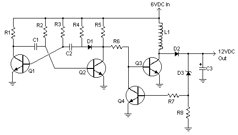 This inverter circuit can provide up to 800mA of 12V power from a 6V supply. For example, you could run 12V car accessories in a 6V car. The circuit is simple, about 75% efficient and quite useful. By changing just a few components, you can also modify it for different voltages.