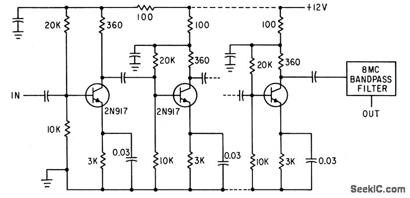 Uses five identical cascaded stages with filter to re store sinusoidal waveform. Phase-shill variations are only 10. Limits input signal by collector current cutoff only. Used in multichannel-tracking receiving system.-S. P. VV.Stranddorf, High-Frequency limiter Amplifier Solves Phase-Shift Problems, Electronics, 35:46, p 44-45.