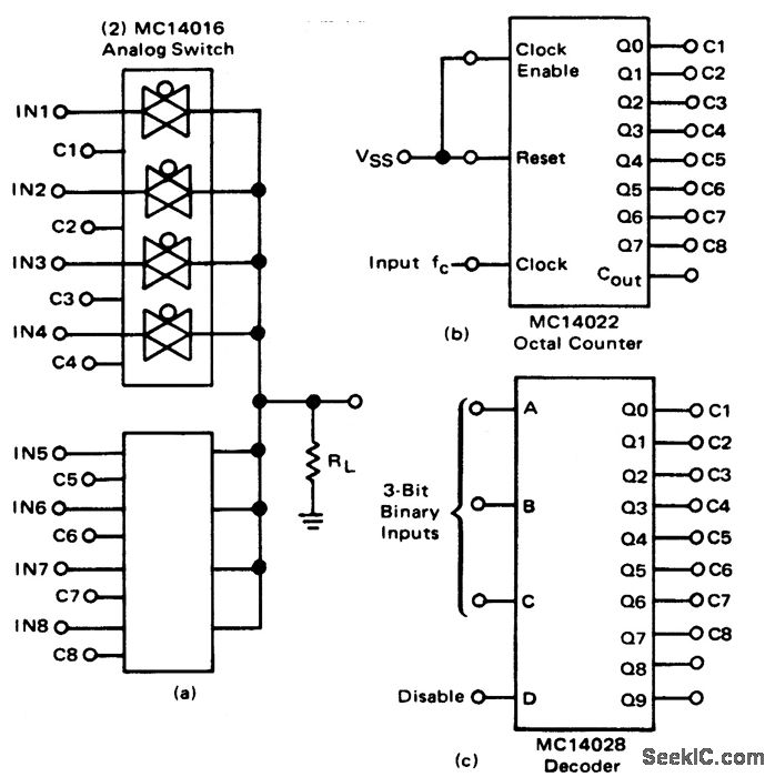 8-cannel analog multiplexer with two methods of selection. Two MC14016s as shown in (a) can be connected for an 8-channel multiplexer. The MC14022 octal counter in (b) is used for time division multiplexing (stepping switch) and each channel is on for one period of the scanning clock. The MC14028 decoder is used for control in applications requiring selection with a 3-bit binary code (courtesy Motorola Semiconductor Products Inc.).