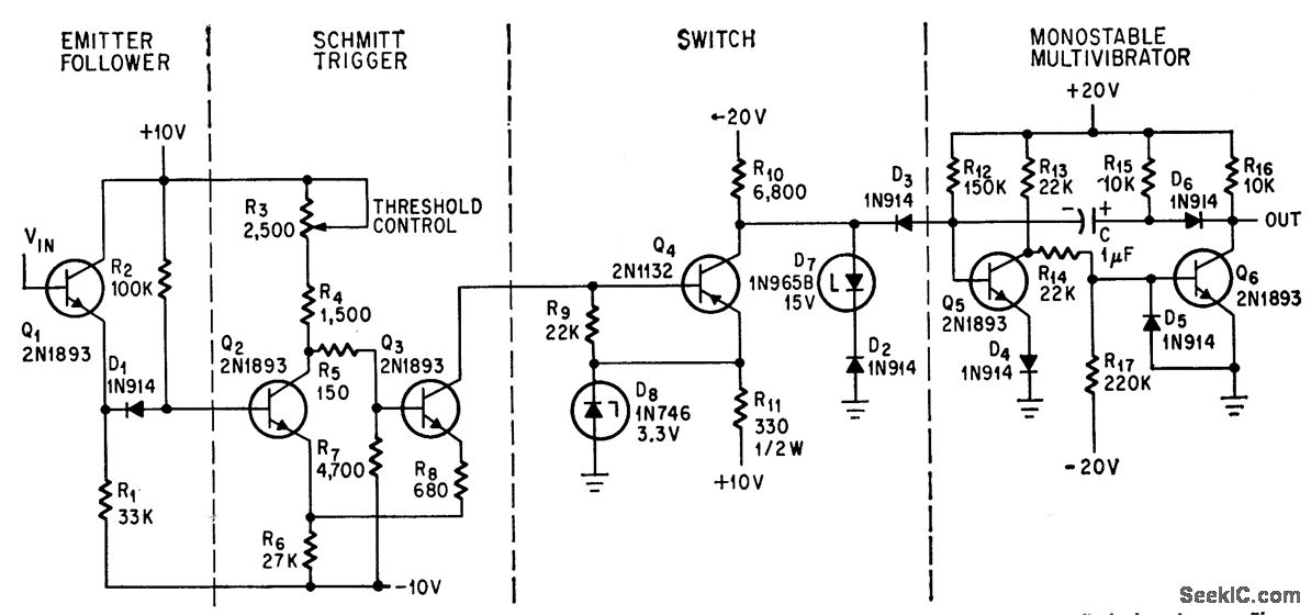 Monostable multivibrator stays on for 96 millisec after Schmitt trigger goes off, while C discharges through R12. -J. R. Giroux, Multi's Output Duration Controlled by Input, Electronics, 38:4, p 88-89.