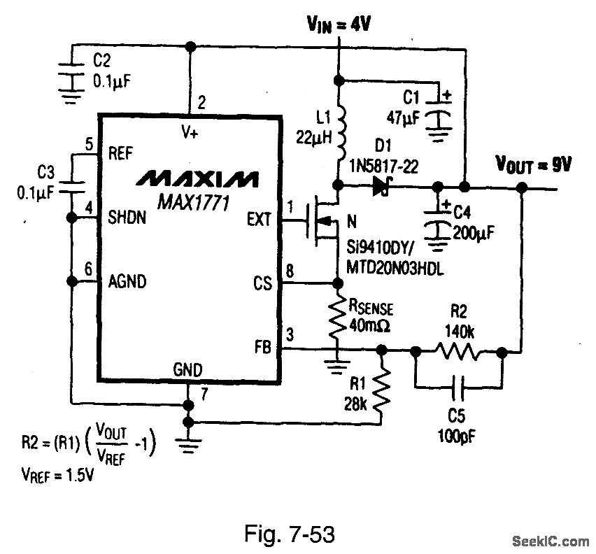 Figure 7-53 shows the MAX1771 connected to provide 9-V output with a 4-V input. See Fig. 7-51 for component suppliers.AXIM NEW RELEASES DATA BOOk, 1995.P4-20.