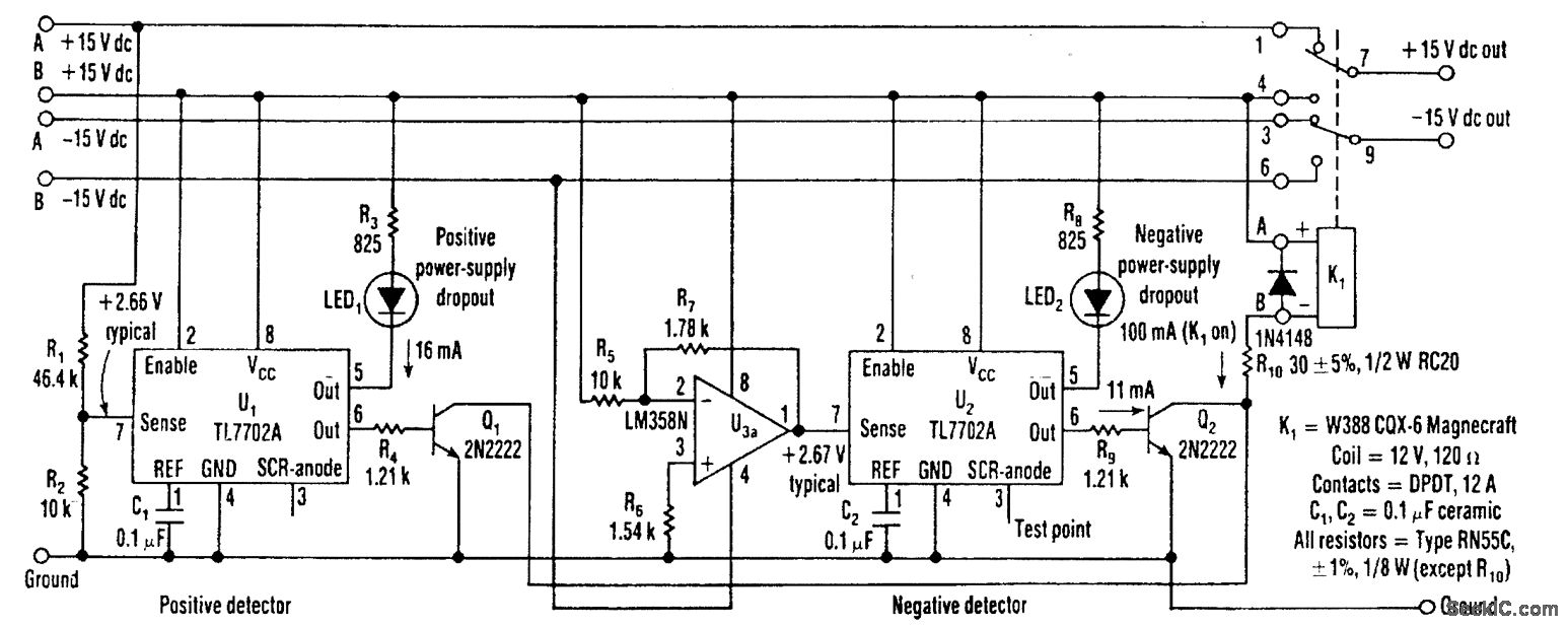 A circuit,which can be built around two TI TL7702 chips, monitors a 15-V power supply and activates a relay to turn on a back-up supply if the voltage drops below±14.1 V. With the back-up in place, the malfunctioning supply can be replaced without any down time. The TL7702 power-supply voltage supervisor chips are intended for use as reset controllers in microprocessor systems, but they work well in their modified form for this application.One chip detects the positive supply (U1),and the other is used for the negative (U2). A pair of output-relay drive transistors,Q1 and Q2 form a wired OR circuit so that relay K1 is activated by the positive or negative voltalge detector that switches U1 or U2 on.The supervisor chips have a direct connection to the input comparator so that the trigger level is set by a resistor-divider network (R1 and R2) at the sense-input pin.These chip also have an internal, stable, reference-voltage source set at +2.53V,typical.The positive-sensed voltage drops enough to activate the comparator, its output goes low,switches the internal gate,and triggers the siliconcontrolled rectifier (SCR).The output comparator then forces the two output transistors (pin 6) turn on the relay driver,Q1.The negative detector is preceded by halt of the dual op amp LM358N (U3a)-an inverting amplifier with a gain of-0.178.R5 connects to the -15 Vdc being sended. The output of U3a is usually set at 2.67 V, higher than the +2.53-V referenCe voltage. Therefore, no switching occurs. If the -15-Vdc voltage decreases, U2 switihes Q2 and activates K1 in the same manner as described for the U1-Q1 positive detector. R3, R4, and R8 through R10 serve as current-ltmtttng reststois.