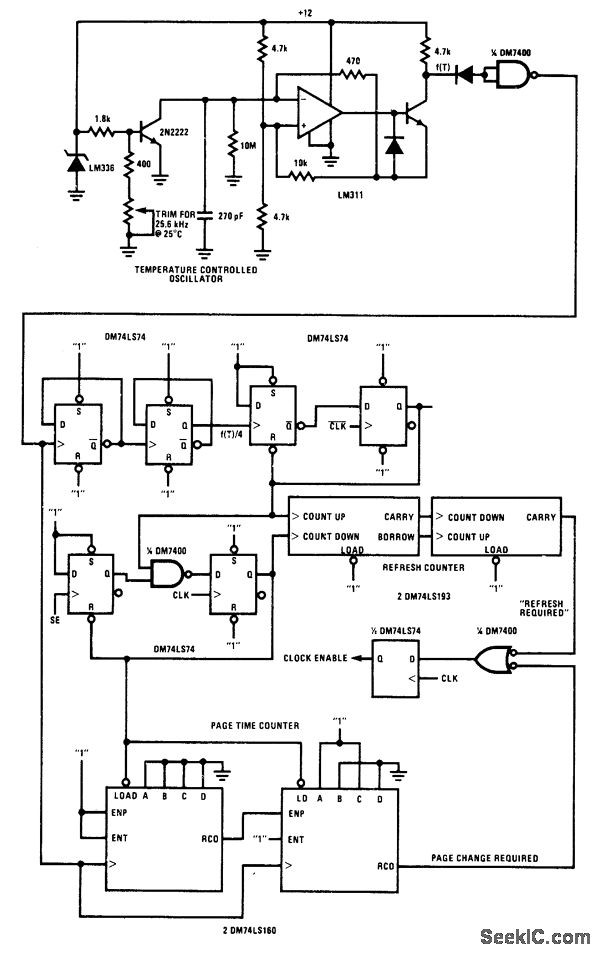 Circuit monitors system utilization of National MM2464 64-kilobit charge-coupled device (CCD). Refresh time and maximum page times are determined by two counters that obtain clock signals from temperature-controlled oscillator.- Memory Applications Handbook, National Semiconductor, Santa Clara, CA, 1978, p 7-1-7-10.