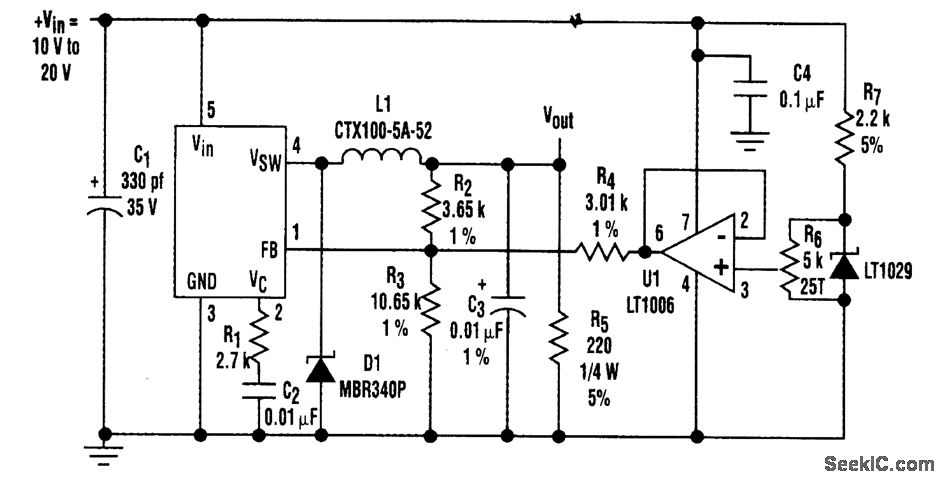 Although linear-regulator ICs are frequently used In variable p。wer-supply applications,they might not always be the best choice,At low output voltages,power losses in these regulators cancause headaches for designers For example,if an output current of 1.25 A is required at 1.25 V from an input of 8 V.a regulator (such as the LT317)dissipates more than 10 W.The figure depicts a dc-dc converter that functionally replaces a linear regulator in the just clescribed application. The converter not only-eliminates the problem of power loss,but it can be adjusted for output voltages (as low as 25 mV)while delivering an output current of 1.5 A.The circuit uses a basic positive-buck topology with one exception,A control voltage is applied through R4 to the feedback summing node at pin of the LT1076 regulator IC,making it possible to adjust the output from0 V to approximately 6 V. This range encompasses the 3.3-V and 5-V logic supplyvoltages for portable and desktop equipment,as well as battery-pack combinations of one to four cells.As R4is driven from0 to 5 V by the buffer (U1),more or less current is required from R2 to satisfy the loop’s desire to hold the feedback summing point at 2.37V. This forces the converter’s out-put to swlng over the range of0 to 6 V.The LT1076 is capable of 1.75-A guaranteed output current In this application,and 2 A is typical.If more current is required,the LT1074 can be substituted for the LT1076.