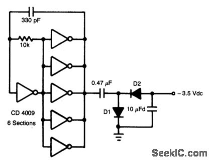 In this circuit, IC1 (CD4009) is used as a square-wave oscillator at approximately 25 kHz. C1 and R1 set this frequency. C2, D1, D2, and C3 form a p-p rectifter, which outputs about -3.5 Vdc. This circuit should be useful where a small negative dc supply is required, but only positive dc voltages are available.
