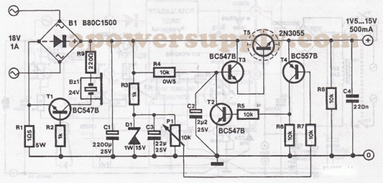 aPowerSupply.com has published a good variable power supply circuit schematic which can be adjusted between 1,5 V and 15 V with a 500 mA maximum current.It uses the well known 2N3055 transistor in a Darlington configuration.