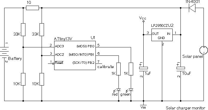 Batwatch is a simple monitor for a solar panel battery charger, using an Atmel ATtiny13V. It periodically measures the charge current and battery voltage, and shows them by blinking two LEDs. I built this circuit into the plug of a VW solar charger panel that is used to prevent a discharge of the battery when a car is not used for some time. A modern car contains a large amount of electronics, and a quiescent current of 40-50mA (about 1Ah per day!) is considered normal .