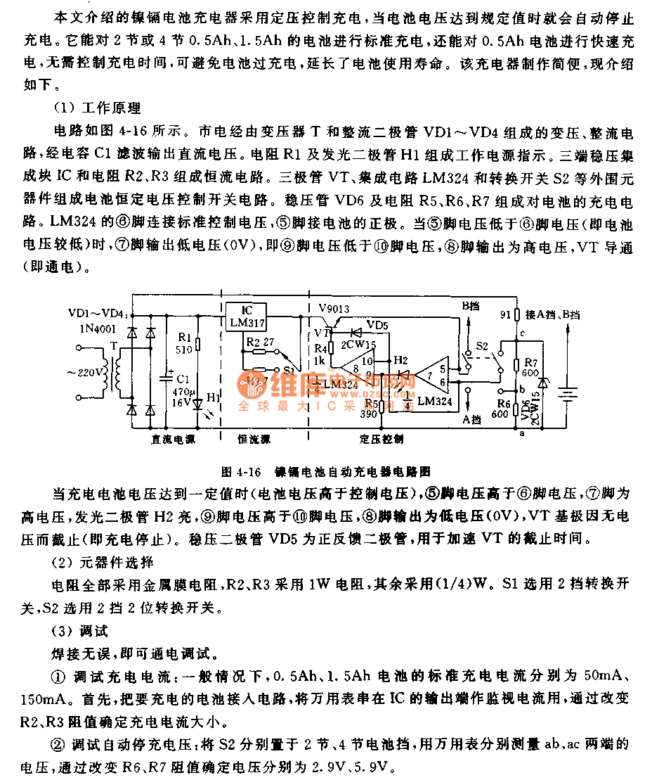 This charger of nickel-cadmium battery adopts given voltage to control charging. It can automaticly stop to charge when the battery voltage reach to prescribed value.working principleThe circuit is shown in diagram 4-16. Commercial power passes transformer, rectifier circuit composed of transformer T and rectifier diode VD1~VD4. Then the commercial power is filtering and outputing DC voltage by capacitor C1. Resistor R1 and LED H1 make up working power light. Three teminal regulator integrated package IC and reistor R2, R3 make up constant current circuit. The peripheral cell is Triode VT, integrated circuit LM324 and transfer switch S2 and so on. They make up constant voltage control switch circuit. Voltage regulator tube VD6 and resistor R5, R6, R7 make up charge circuit to battery. LM324's pin 6 connects standard control voltage. LM324's pin 5 connects anode of battery. When pin 5's voltage is lower than pin 6's (that is battery voltage is lower), pin 7 will output low voltage (0V). That is, pin 9's voltage si lower than pin 10's. Pin 8's output is high level, VT is turn on (that is power turn on).