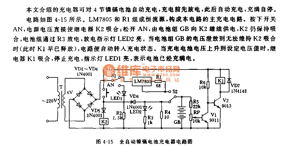 The circuit is as shown in figure 4-15. The constant current source is composed of the LM7805 and R1. IF you press the switch AN, the power supply voltage will make the relay K2 close; if you loosen the AN, the battery pack GB still supplies the power to the K2, so K2 is also in the closing state, the battery pack discharges through R3, the discharge indicator light LED2 turns on. When the battery pack GB's voltage can not maintain the closing of K2, the circuit will get into the charging state automaticly. When the rechargeable battery voltage increases to the set voltage, the relay K closes to stop charging, the indicator light LED1 turns on, this means the battery is full.