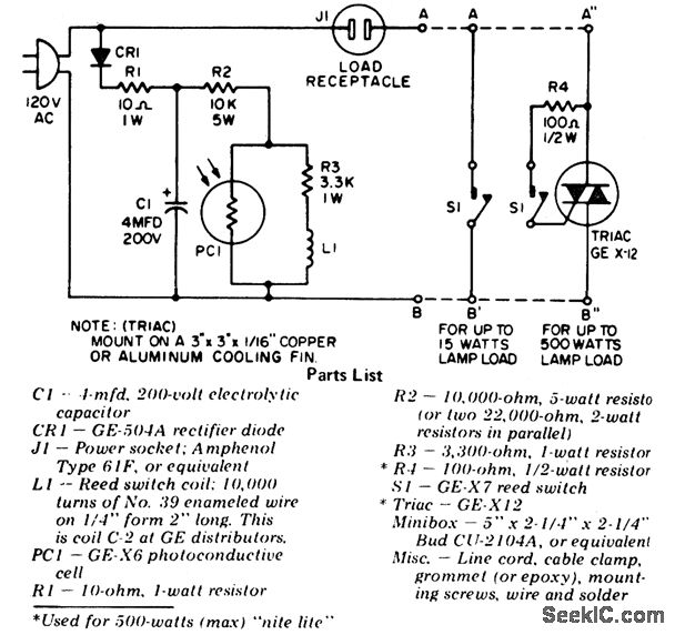 Automatic night light to discourage prowlers or burglars. One of two circuits can be built as shown in the schematic, depending on the requirements. For small loads, 15 watts, the reed switch can directly control the light (courtesy General Electric Company).