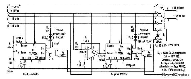 A supply monitor using two TL7702A chips monitors the ±15-V supplies and activates the backup supply in case of a voltage drop. Although the chips are intended for use as reset controllers in microprocessor systems, they work well in this application.