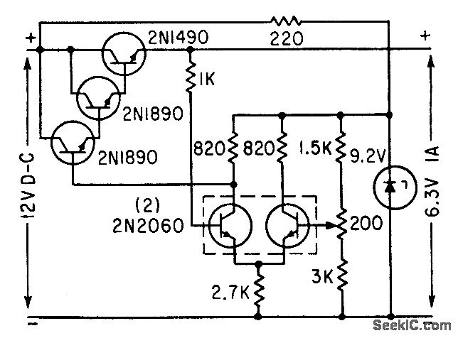 Provides constant voltage for filament of backward-wave oscillator. Output voltage is compared with fixed reference in d-c amplifier, and difference is used to control series pass element.-S. Prigozy, Designing Special Power Supplies for Voltage Tunable Oscillators, Electronics, 35:44, p 48-50.