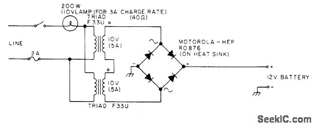 Uses 200-W lamp as current-limiting resistor in transformer primary circuit. Serves in place of older types of chargers using copper-oxide or tungar-bulb rectifiers.-H.Olson, Battery Chargers Exposed, 73 Magazine, Nov.1976, p 98-100 and 102-104.