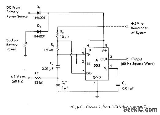Provides 60-Hz square-wave output for driving electronic timekeeping circuits from battery during AC power failure, 555 timer is connected as square-wave astable MVBR normally locked to incoming 60-Hz power frequency. Rt should be trimlned for zero beat wiih 60-Hz soulco. When primary power fails, reference voltage disappears and effect of C1 on frequency is minimized. 555 now oscillates at frequency determined by Rt and Ct, Which is 60 Hz. Use 6-V battery.-W. G. Jung, IC Timer Cookbook, Howard W. Sams, Indianapolis, IN, 1977,p 201-203.