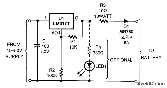 The circuit is built around an LM317T adjustable voltage regulator. Its output voltage (VOUT) is determined by the formula VOUT= l.25 (1+R2/R1). I chose a 10-kΩ resistor for R1 and a 100-kΩ resistor for R2 to allow for a little wasted current flow (around 125 μA). This will develop 13.75 V between the output terminal and ground. R3 and a diode prevent burnout if the terminals are shorted or reversed, and prevent battery discharge in the event that the regulator is disconnected from the main power supply. The capacitor is optional but will make life easier on the chip under an extreme charging cycle. With proper heat sinking, the IC is capable of carrying 1.5 A to the battery. The circuit can be left hooked to the battery all of the time and will not overcharge it.