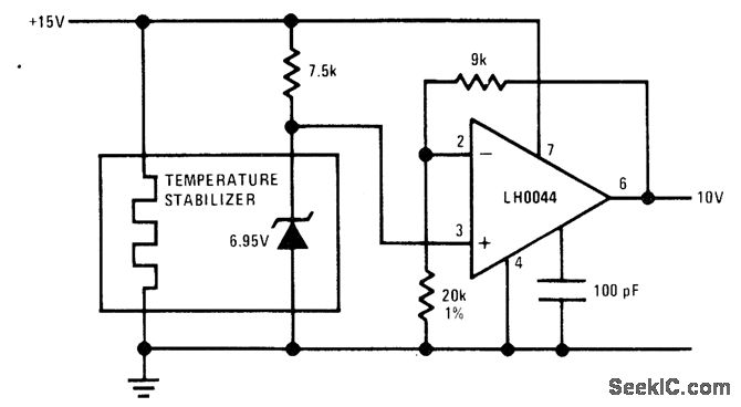 Reference voltage developed by National LM199 temperature-stabilized IC is 6.95 V with very low temperature drift and excellent long-term stability. LH0044 precision low-noise opamp is used to scale and buffer reference to give required output of 10 V. Regulation of 15-V supply need be only about 1%.- Linear Applications, Vol. 2, National Semiconductor, Santa Clara, CA, 1976, AN-161, p 5.