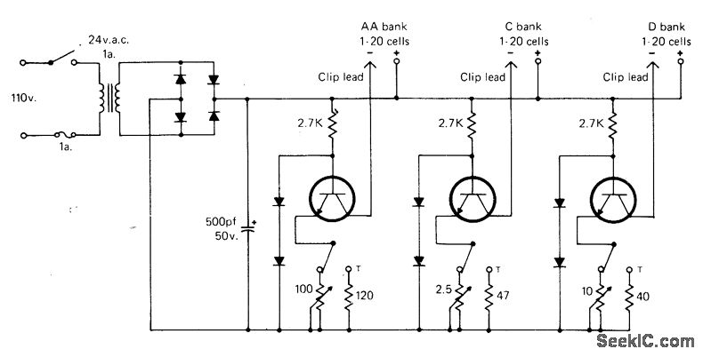 Can handle up to 20 AA cells, 20 C cells, and 20 D cells simultaneouslt, with charging rate determined separately for each type. Single transfrmer and fullwave rectifier feed about 24 VCD to three separate regulators. AA-cell regulator uses 100-ohm resistor to vary charge rate from 6 mA to above 45 mA, C-cell chargerate range is 24 to 125 mA, and D-cell range is 60 to 150 mA. Batteries of each type should be about same state of discharge. Batteries are recharged in series to avoid need for separate regulator with each cell. Tricklecharge switches cut charge rates to about 2% of rated normal charge (5 mA for 500-mAh AA cells).Transistors are 2N4896 or equivalent. Use heatsinks. All diodes are 1N4002.-J.J. Schultz, A Bull Ni-Cad Recharger, CQ, Dec. 1977, p 35-36 and 111.