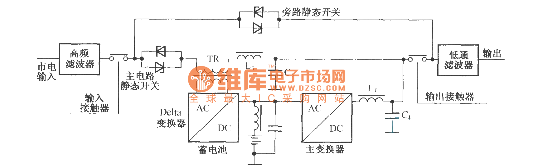 http://www.seekic.com/circuit_diagram/Power_Supply_Circuit/Basic_consititution_block_diaagram_of_Delta_transform_UPS.html