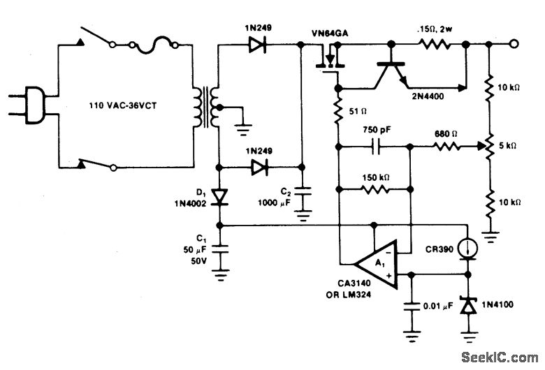 Operation amplifier A1 directly drives the VN64GA with the error signal to control the output voltage. Peak rectifier D1, C1 supplies error amplifier A1 and the reference zener. This extra drive voltage must exceed its source voltage by several volts for the VN64GA to pass full load current. The output voltage is pulsating dc which is quite satisfactory for battery charging. To convert the system to a regulated dc supply, capacitor C2 is increased and another electrolytic capacitor is added across the load. The response time is very fast, being determined by the op-amp. The 2N4400 current limiter circuit prevents the output current from exceeding 4.5 A. However, maintaining a shorted condition for more than a second will cause the VN64GA to exceed its temperature ratings.A generous heat sink, on the order of 1℃/W, must be used.